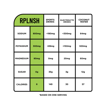 Leading sports drink competitors only contain around 160mg sodium & 50mg of potassium, RPLNSH contains 5-10x that amount, meaning you would need to consume one serve of RPLNSH as opposed to 5-10 of competitors. With RPLNSH, you can ensure your body's vital systems are always firing on all cylinders.